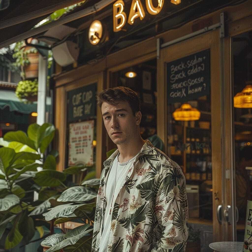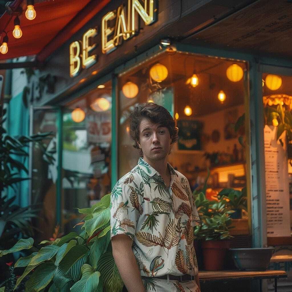 Prompt for ChatGPT: Can you help me change this Midjourney prompt to make it look like it’s a hot summer season and make the vibe of the photo tropical? Photograph of a guy model in a wintery location, in front of a coffee shop named "BEANS", 35mm lens, cinematic, natural lighting, drama, photo-realistic, 8k super detailed --v 6.0