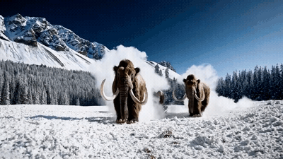 Prompt: “Several giant wooly mammoths approach treading through a snowy meadow, their long wooly fur lightly blows in the wind as they walk, snow covered trees and dramatic snow capped mountains in the distance, mid afternoon light with wispy clouds and a sun high in the distance creates a warm glow, the low camera view is stunning capturing the large furry mammal with beautiful photography, depth of field.”